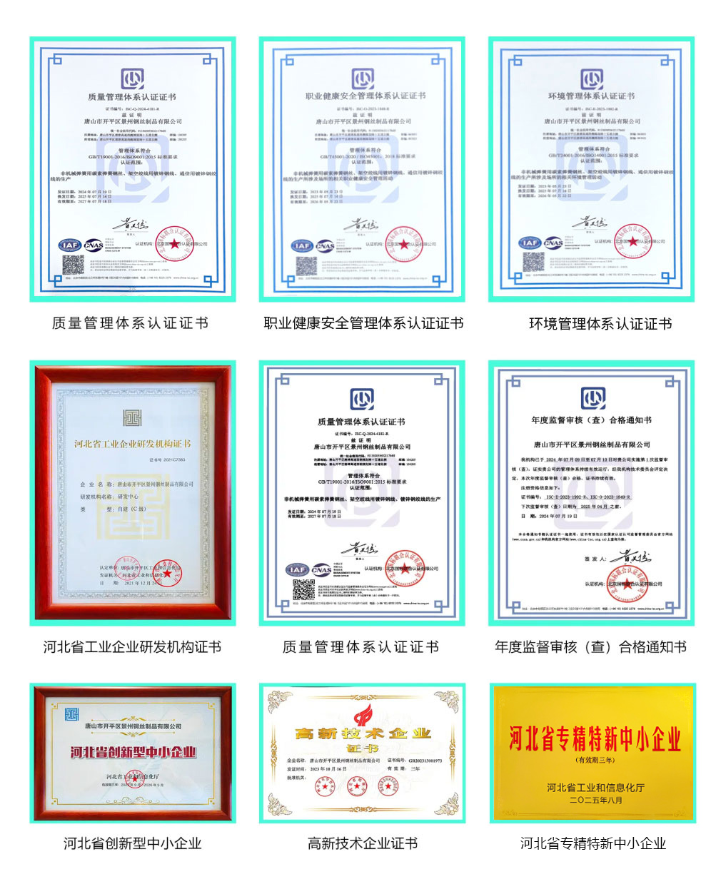 唐山市开平区景州钢丝制品有限公司建于1998年,是华北地区较大的钢丝制品生产企业,年生产能力13万余吨,占地面积50000多平方米,地处京津冀协同发展城市之一的唐山市,北依燕山,南邻渤海,距北京170多公里,距天津港100公里,距唐山市曹妃甸港和京唐港60-80公里,地理位置优越,交通便利。公司拥有拔丝、热处理、镀锌、绞线、制模等生产线。